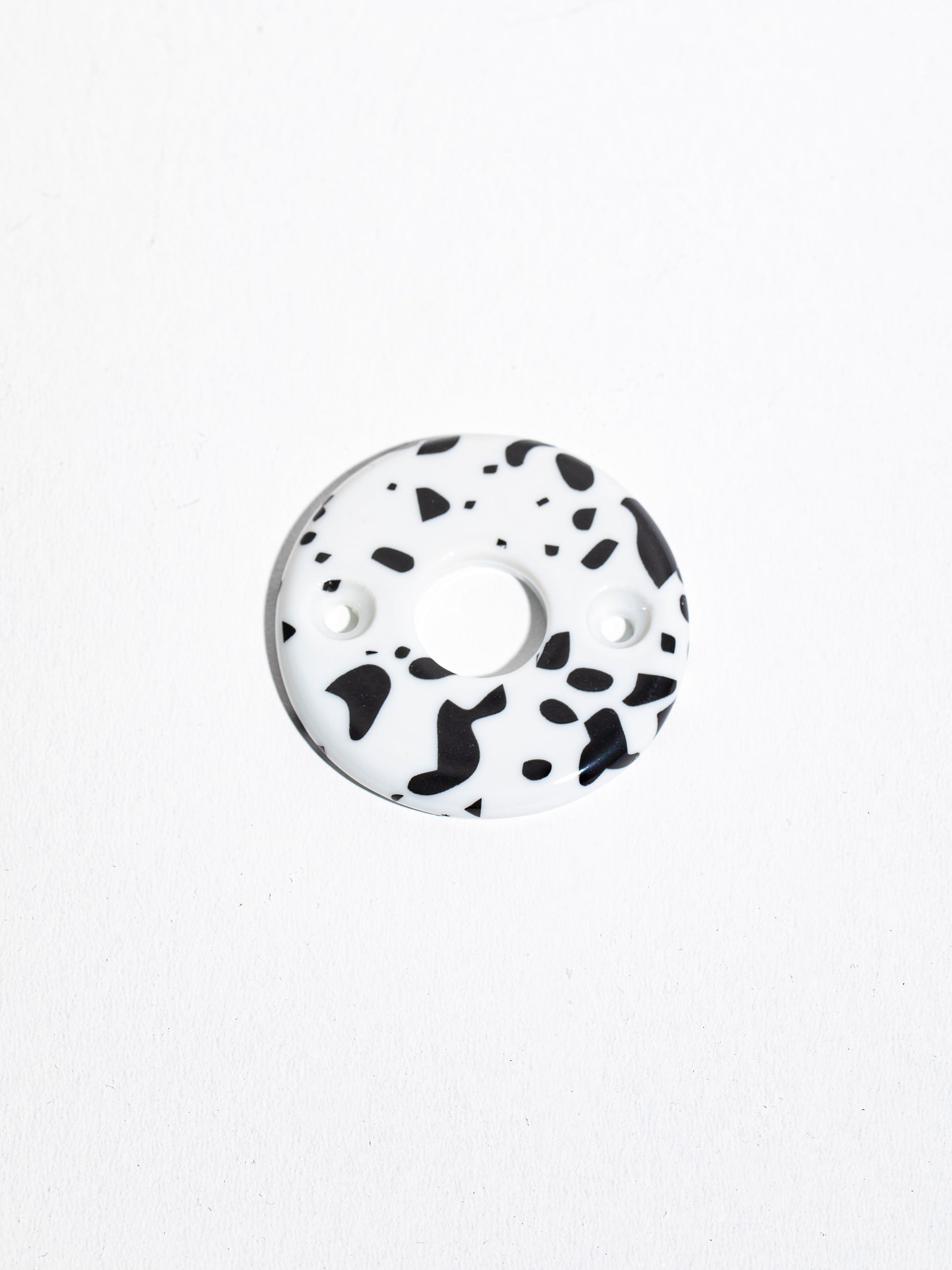 Rosace décorative en porcelaine de Limoges à fixer entre la poignée et la porte, fabriquée et décorée à la main dans le motif intemporel Meta Averse de la maison Non Sans Raison décliné dans trois coloris, Orange, Noir et Vert.