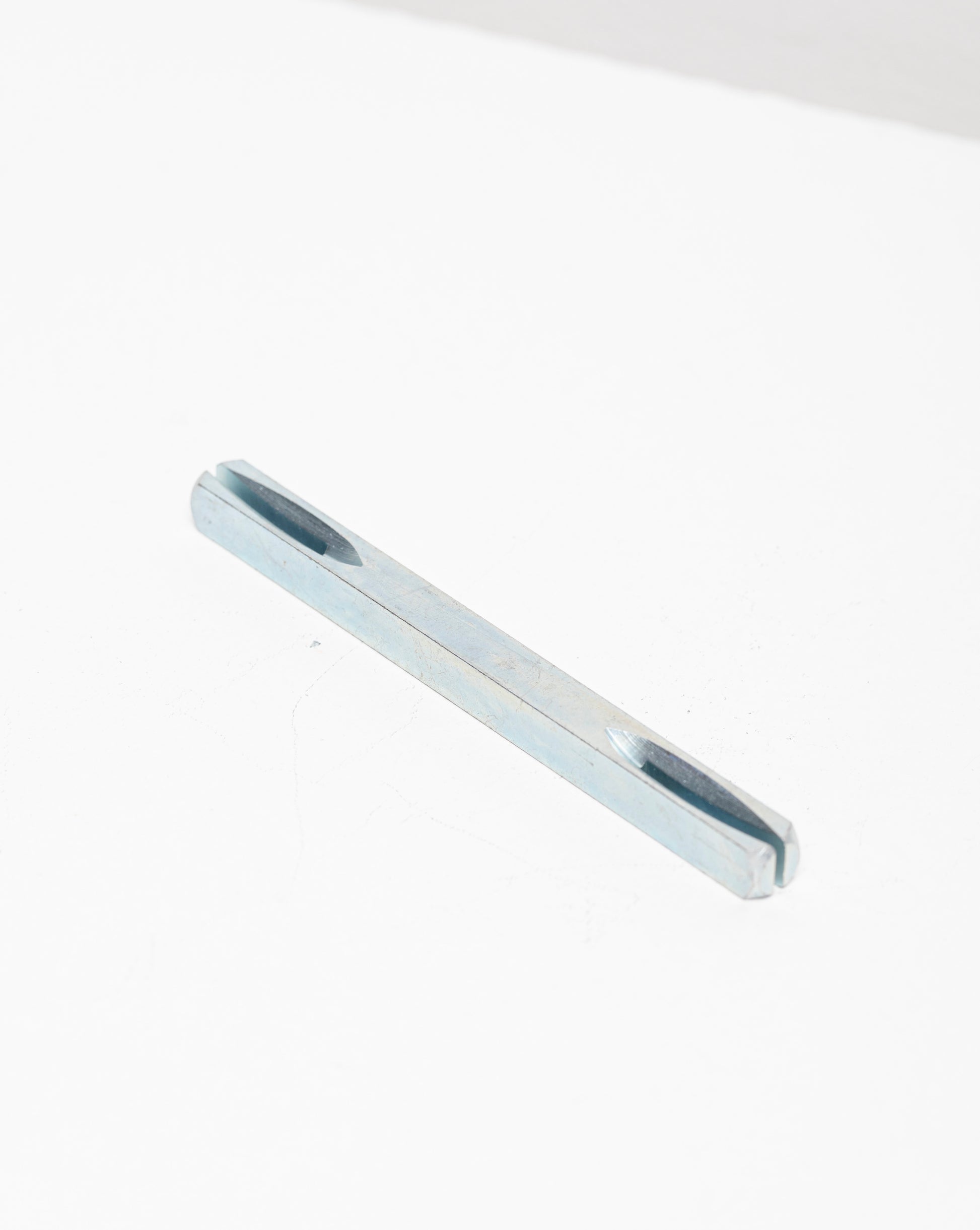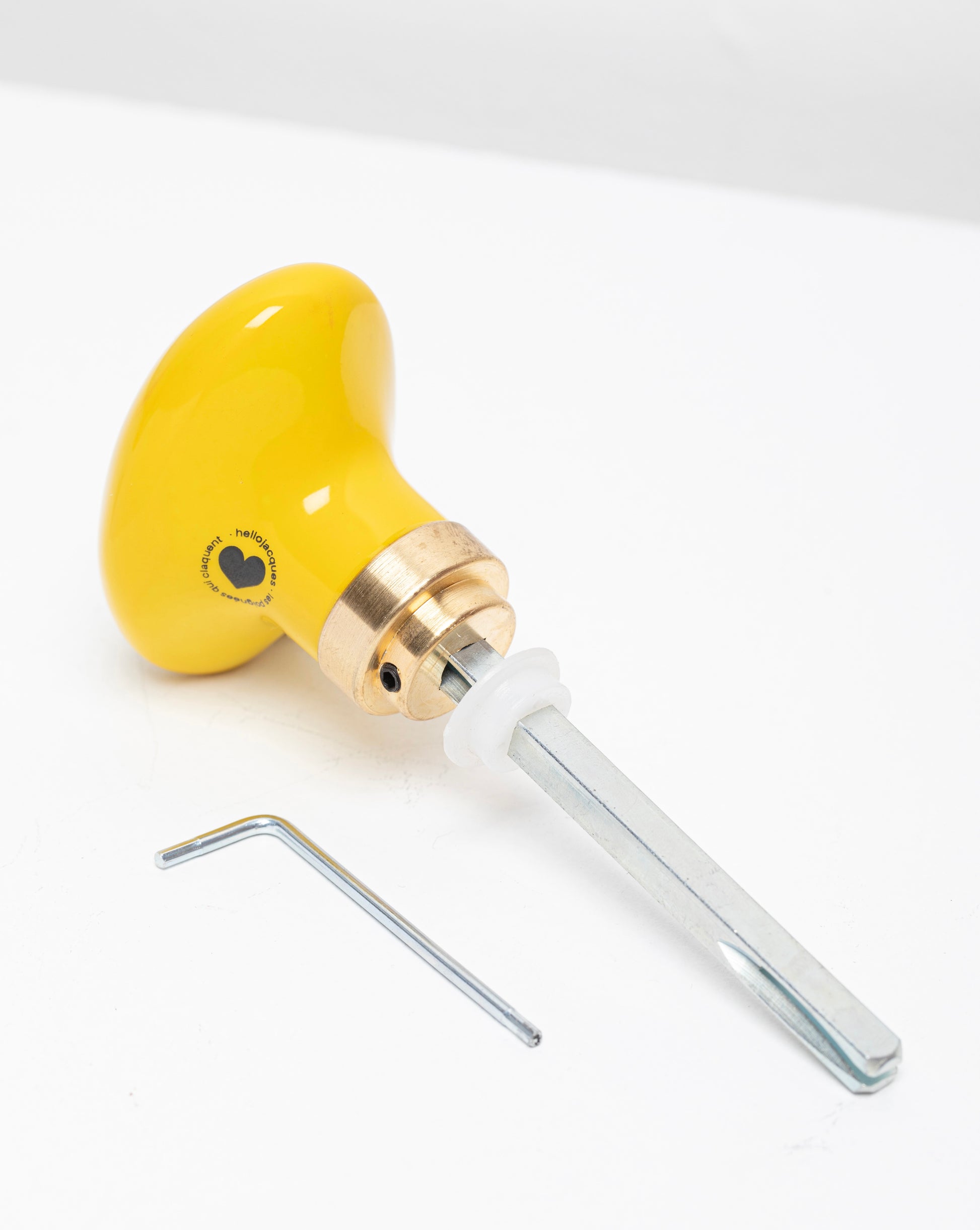 Tige carrée en acier qui relie les deux poignées d’une porte, fendue à ses extrémités pour permettre un serrage direct par la vis pointeau pré-insérée dans les poignées Hello Jacques.